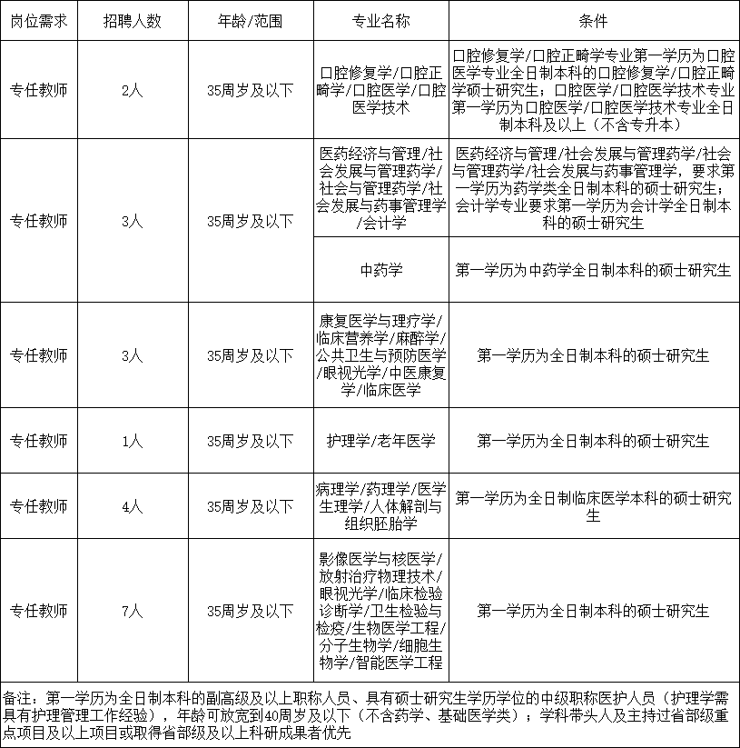 3.應(yīng)聘人員需為全日制碩士研究生畢業(yè),第一學(xué)歷為全日制本科;副高級職稱學(xué)歷放寬至全日制本科。碩士研究生年齡在35周歲及以下,第一學(xué)歷為全日制本科的副高級及以上職稱人員、具有碩士研究生學(xué)歷學(xué)位的中級職稱醫(yī)護(hù)人員(護(hù)理學(xué)需具有護(hù)理管理工作經(jīng)驗),年齡可放寬到40周歲及以下(不含藥學(xué)、基礎(chǔ)醫(yī)學(xué)類);學(xué)科帶頭人及主持過省部級重點(diǎn)項目及以上項目或取得省部級及以上科研成果者優(yōu)先。第一學(xué)歷為全日制本科畢業(yè)生可以應(yīng)聘急需緊缺崗位。