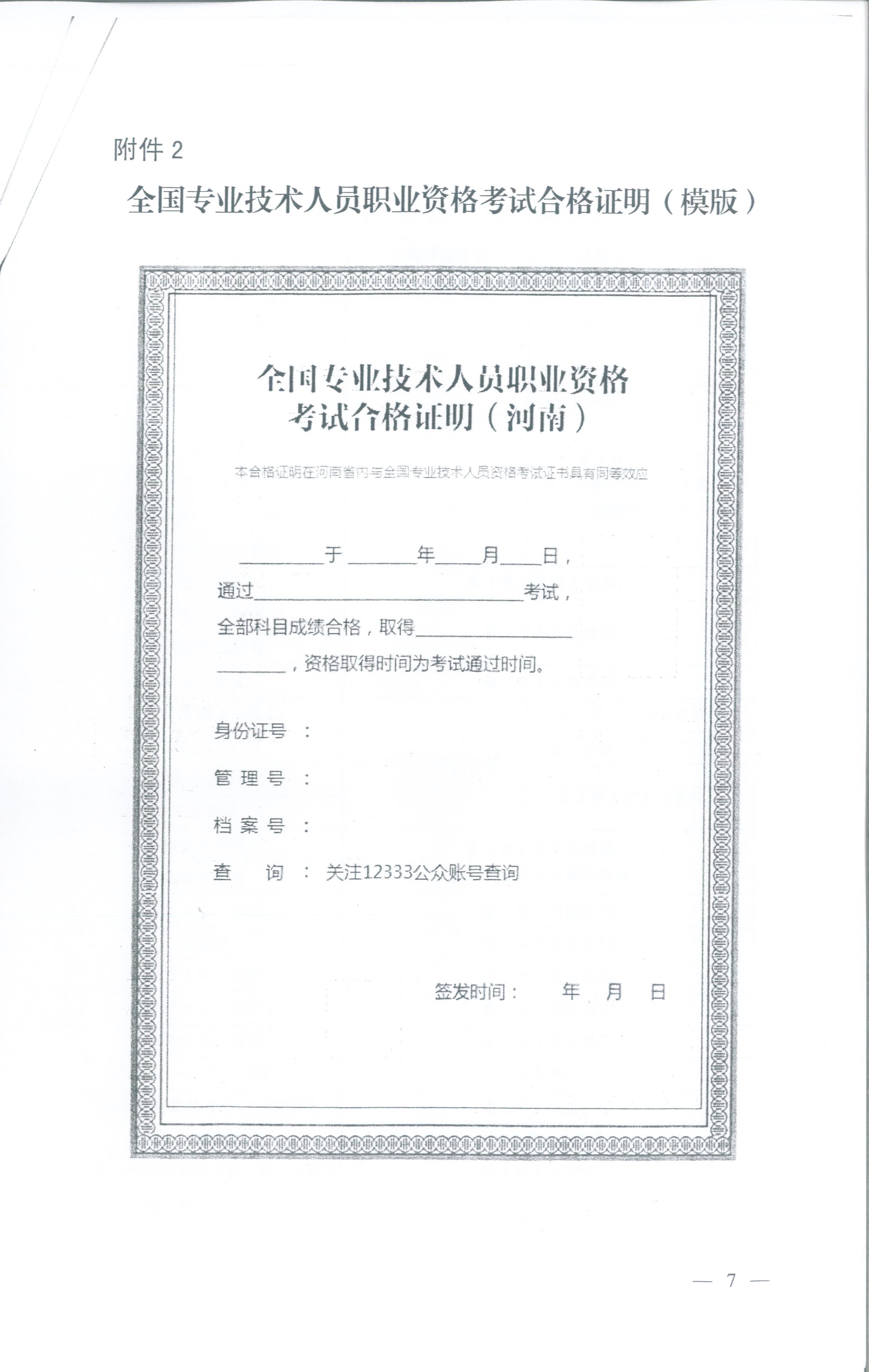 (三)全國統(tǒng)考的專業(yè)技術(shù)人員職業(yè)資格紙質(zhì)證書發(fā)放到我省之前,由省人力資源和社會保障廳制發(fā)“全國專業(yè)技術(shù)人員職業(yè)資格考試合格證明(河南)”(模版見附件2),考試成績合格的考生可自主登錄“河南省政務(wù)服務(wù)網(wǎng)”下載。紙質(zhì)證書下發(fā)我省后,考生可向行業(yè)行政管理部門申領(lǐng)。